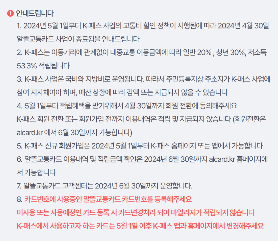 기존의 알뜰교통카드를 쓰고 계시던 분들은 꼭 k-패스 카드로 전환 신청을 해야 사용이 가능합니다.