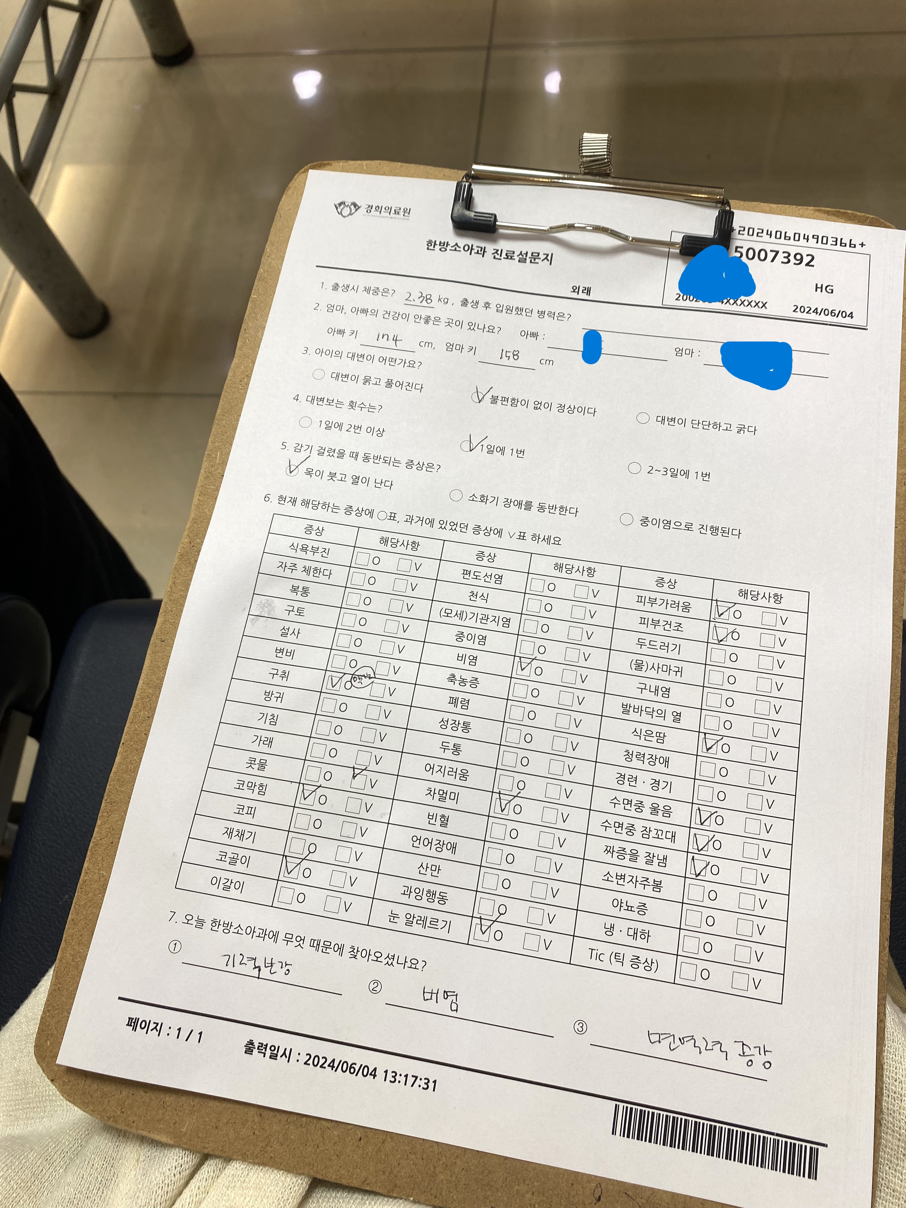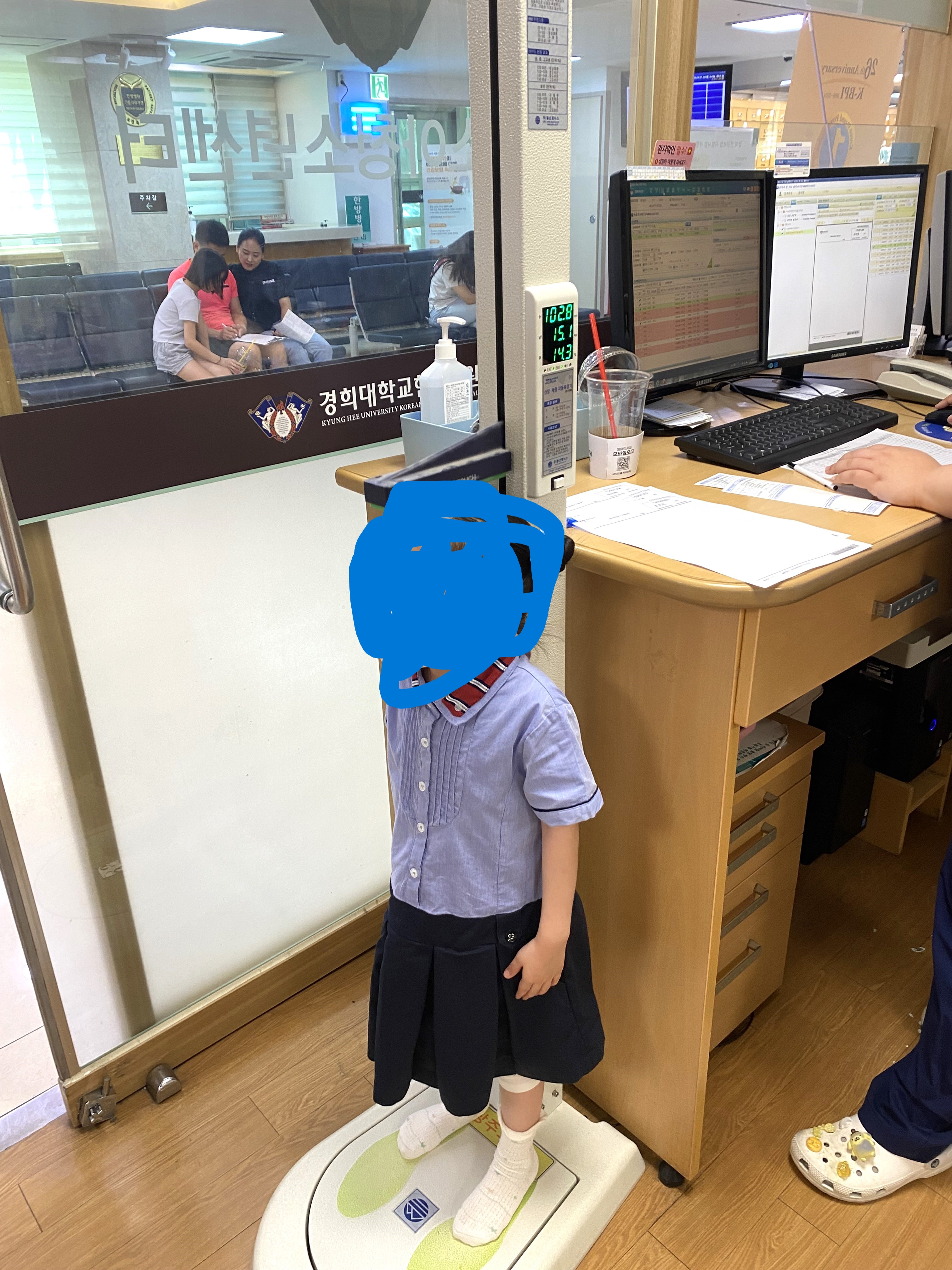 진료대기실로 가면 간호사 선생님께서 키를 재고, 설문지 하나를 주세요.